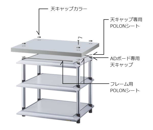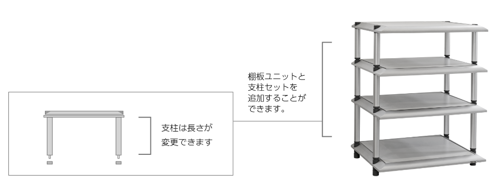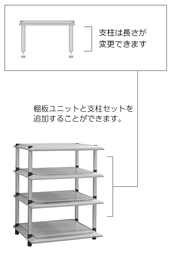 通过为您的音响架添加架板单元和支柱套件,可以制作原创音响架,层数和支柱长度均可选择。