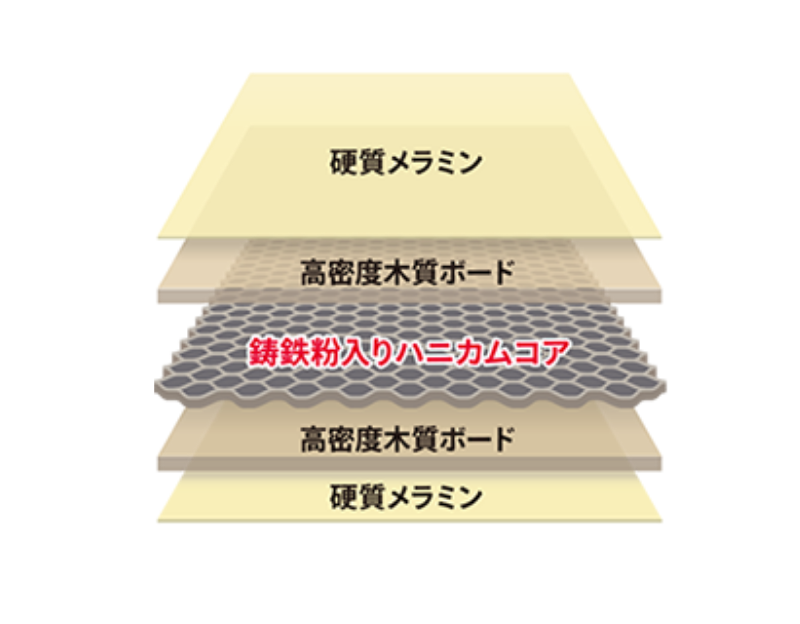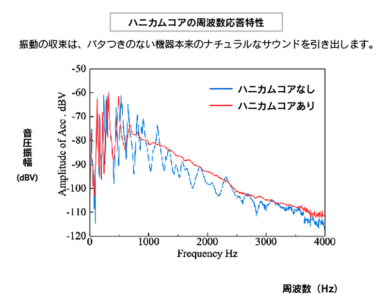 大量填充铸铁粉的蜂窝芯实现了高水平的吸振性能和刚性。"适度吸收振动"和"适度释放振动"是铸铁粉的2个特性,作为将振动能转化为热能的摩擦减振技术,能让音响设备尽情发挥原有的性能,可以说是提供"最好的舞台"。