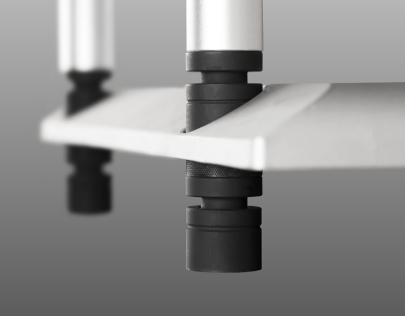 4个尖钉高度均可调整。稳固的架板足以承载重型设备,尽管只有尖头作为接触点,却能实现优异的稳定性。-