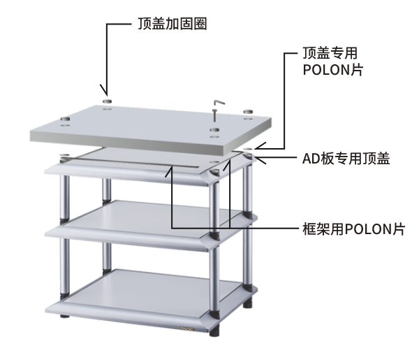 运用振动绝缘技术,仅由框架上的4个尖头支撑承载音响设备的架板,以避免架板干扰压铸框架,从而使架板承受的振动不向其他层传递,形成适度释放振动的结构。