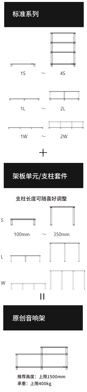通过为您的音响架添加架板单元和支柱套件,可以制作原创音响架,层数和支柱长度均可选择。
