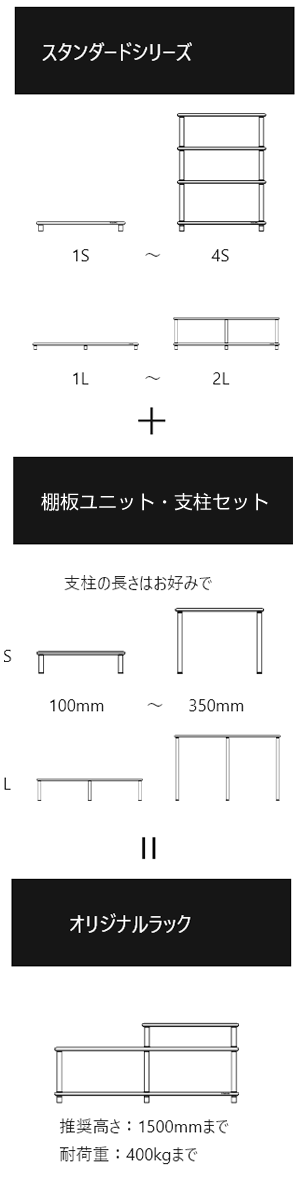通过为您的音响架添加架板单元和支柱套件,可以制作原创音响架,层数和支柱长度均可选择。