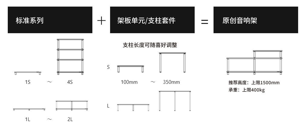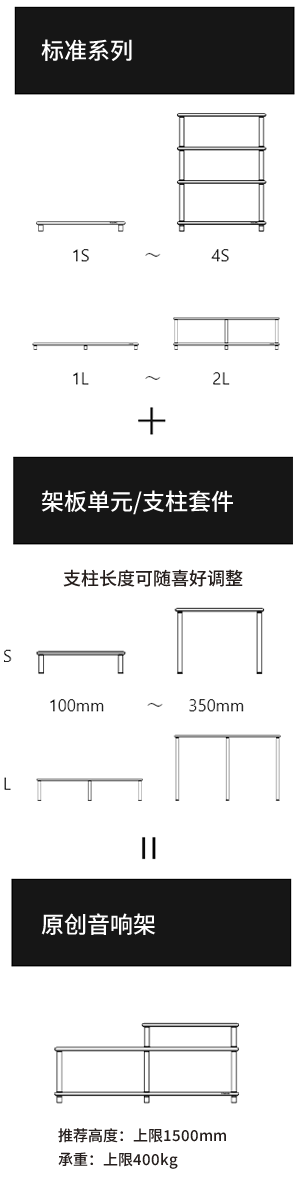 通过为您的音响架添加架板单元和支柱套件,可以制作原创音响架,层数和支柱长度均可选择。