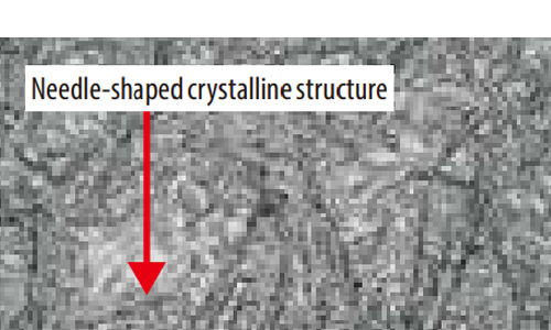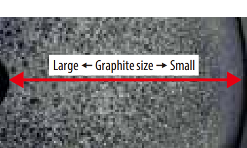 Gradation cast ironIn this cast iron material, the graphite pieces closer to the perimeter are smaller and those near the center are larger.